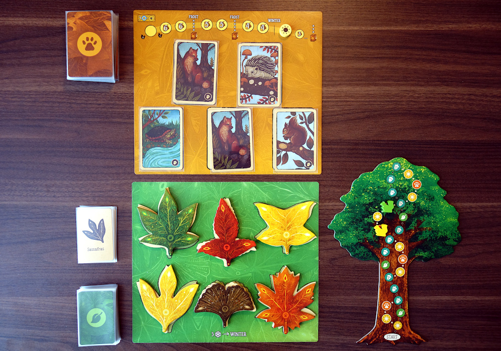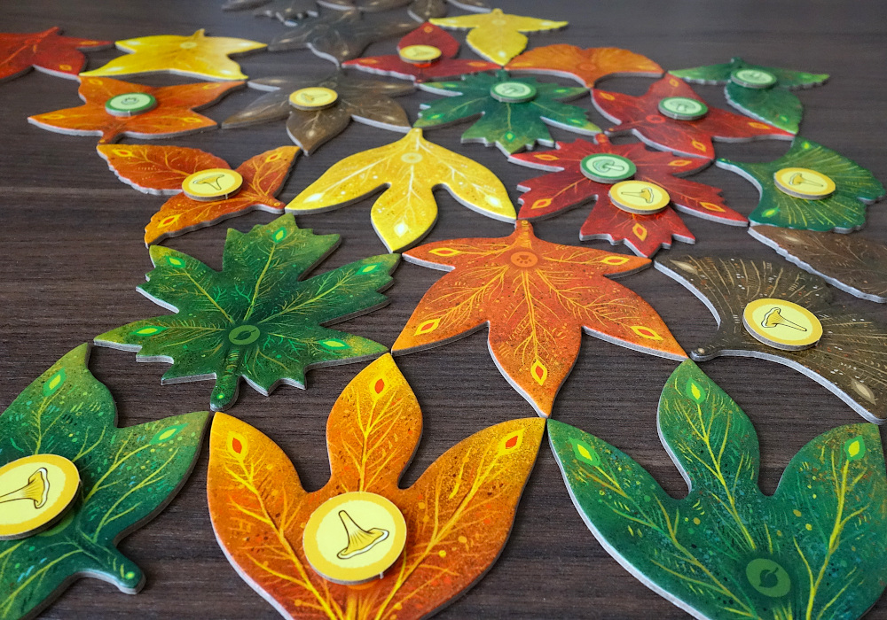 Få andra spel gör sig så bra på bordet som Leaf – det är omöjligt att inte bli charmad av de färggranna höstlöven som breder ut sig och de detaljrika djurkorten i harmoniska färgskalor (lite som om Arts and Crafts-rörelsen tagit steget in i 2020-talet). Bra jobbat av illustratören Angela Rizza.